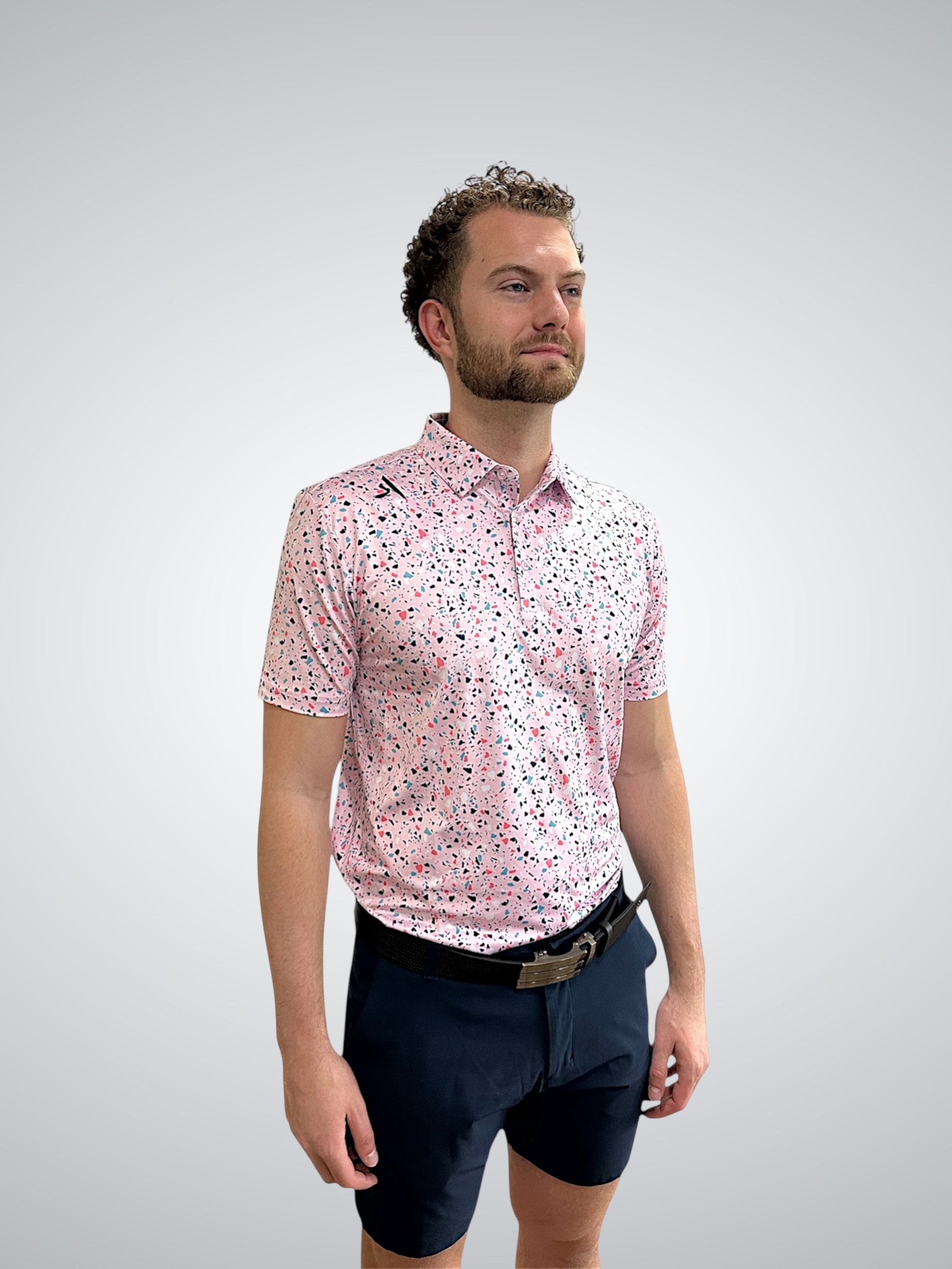 The Dayglow Polo is built for those who show up loud and finish strong. Its terrazzo-inspired print brings playful contrast to a soft pink base, while the technical fabric works behind the scenes to keep you dry, cool, and comfortable. Whether you're chasing birdies or the best vibes, Dayglow delivers the right energy every time.
