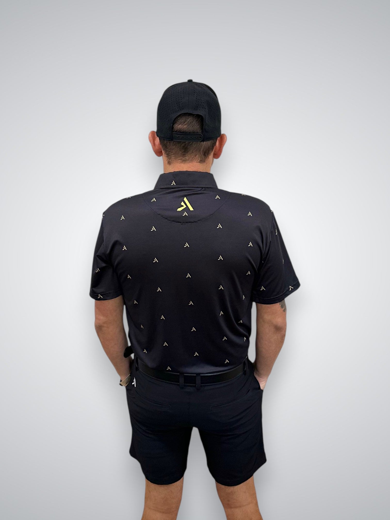The Aureus Polo merges luxury with high performance through its black and gold micro-logo pattern, inspired by the Roman gold coin. Constructed from 92% polyester and 8% spandex, this men's golf polo offers moisture-wicking fabric and 4-way stretch for optimal mobility and comfort. With UPF 30 sun protection and an athletic-tailored fit, it ensures you stay cool, dry, and shielded throughout your round. Finished with a silicone Aura Golf logo and cursive sleeve label, the Aureus Polo stands as a flagship piece for players seeking distinguished presence on the course.