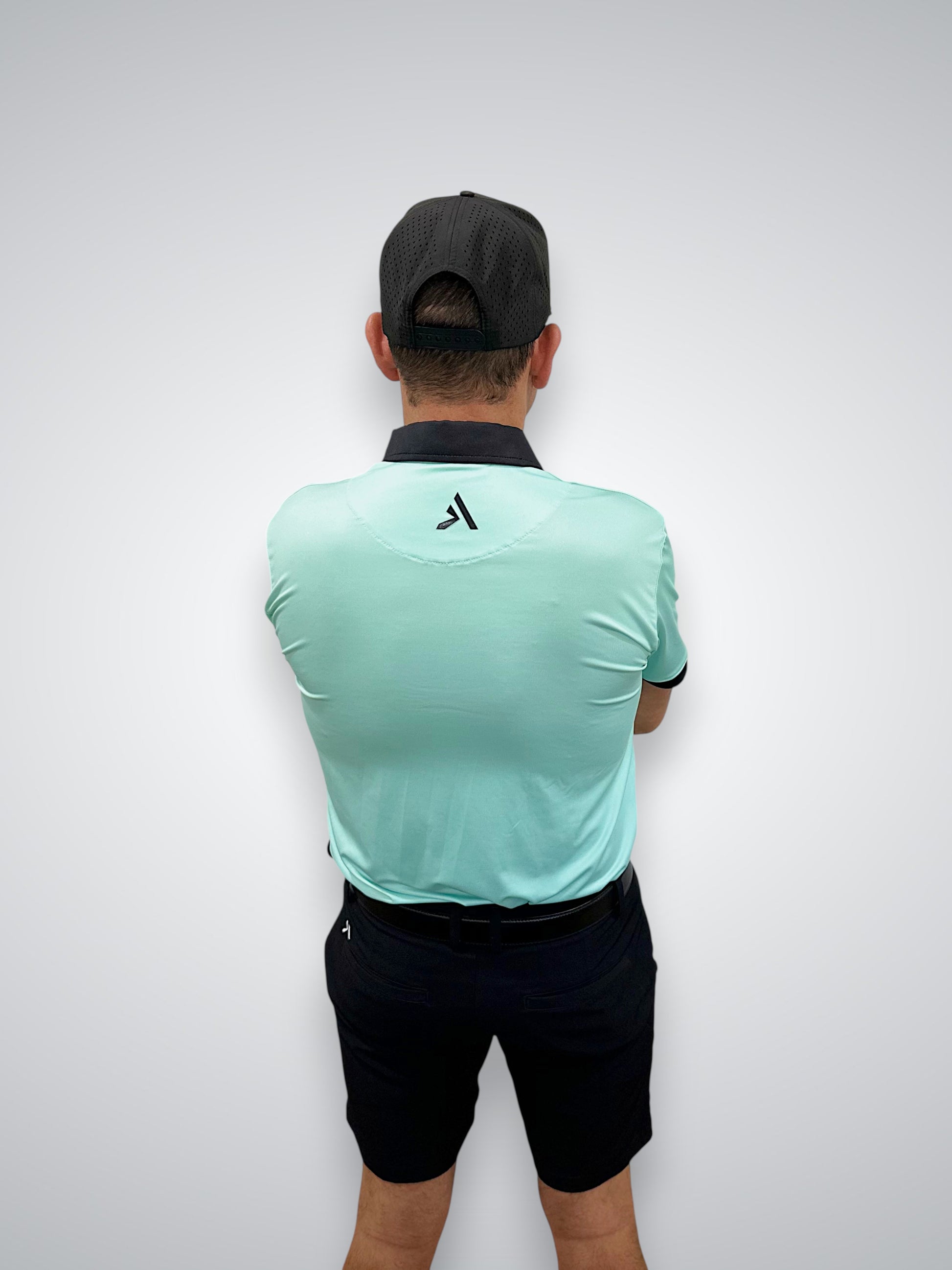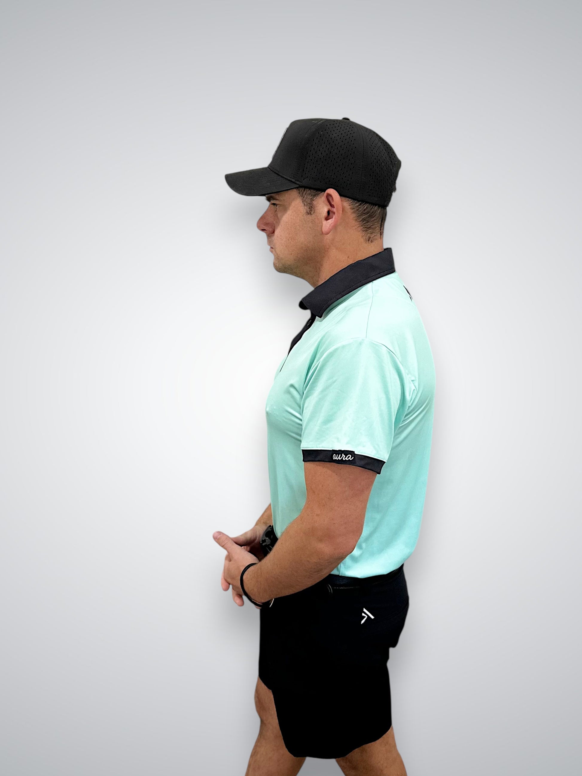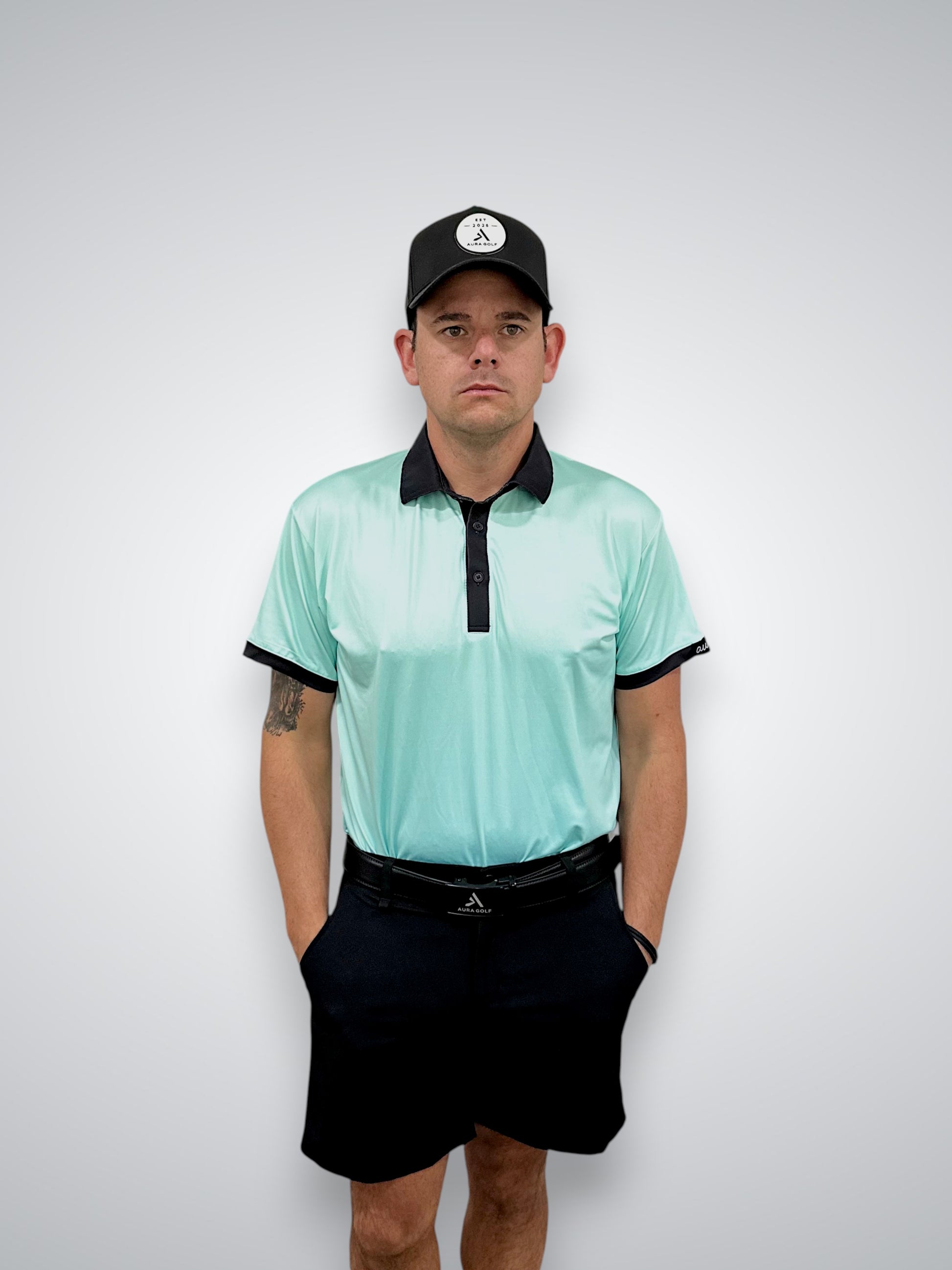 The Laguna Polo offers a fresh mint tone accented by a bold black collar, merging coastal style with performance. Crafted from 92% polyester and 8% spandex, this lightweight polo features 4-way stretch fabric for unrestricted movement and moisture-wicking technology to keep you cool and dry. Its UPF 30 protection guards against sun exposure, while the athletic-tailored fit enhances comfort and style. Finished with a silicone Aura Golf logo and cursive sleeve label, the Laguna Polo is engineered for modern golfers who seek confidence from tee to green.