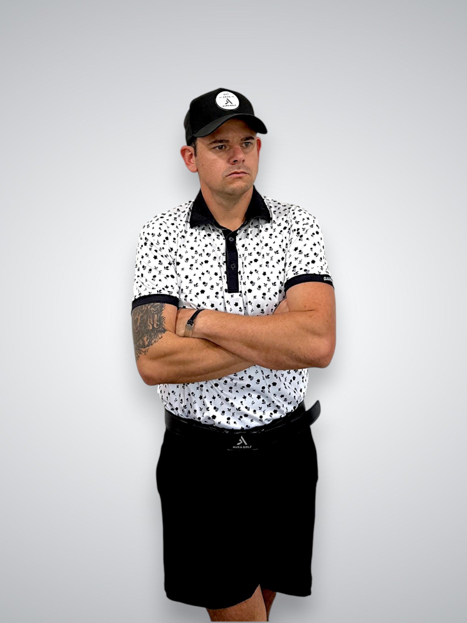 The Shadow Bloom Polo combines sophisticated style with high-performance technology. Crafted from a 92% polyester and 8% spandex blend, this moisture-wicking golf shirt features 4-way stretch fabric that moves with you and an athletic-tailored fit for a sharp silhouette. Its crisp white base with a subtle black floral micro-print enhances its modern look, while UPF 30 protection shields you from harmful sun rays. Finished with a silicone Aura Golf logo under the collar and a cursive sleeve label, the Shadow Bloom Polo delivers confidence and comfort from the first tee to the 19th hole.