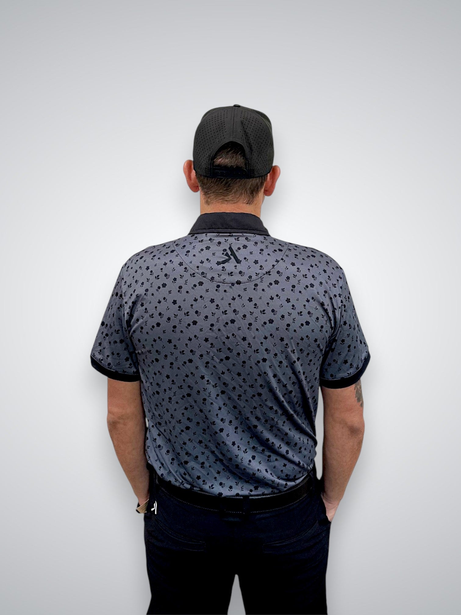 The Onyx Bloom Polo combines a refined dark grey palette with subtle black floral accents, delivering understated sophistication for the golf course. Crafted from a 92% polyester and 8% spandex blend, its 4-way stretch fabric ensures unrestricted movement and an athletic-tailored fit. Moisture-wicking technology keeps you dry and comfortable, while UPF 30 protection shields you from harmful sun exposure. Lightweight and performance-driven, this polo seamlessly transitions from competitive rounds to stylish clubhouse wear, accented with a silicone Aura Golf logo and elegant cursive sleeve label.
